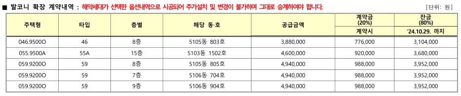 "해약세대가 선택한 계약타입별 및 공간옵션, 선택품목의 추가설치 및 변경 불가!"