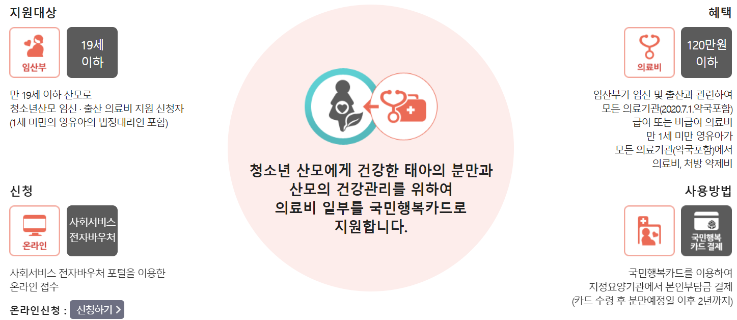 | 청소년산모 임신·출산 의료비 지원 | 임신 1회 당 120만원 범위 내. 임신부가 산부인과 병·의원에서 임신 및 출산과 관련하여 진료 받은 급여 또는 비급여 의료비 |