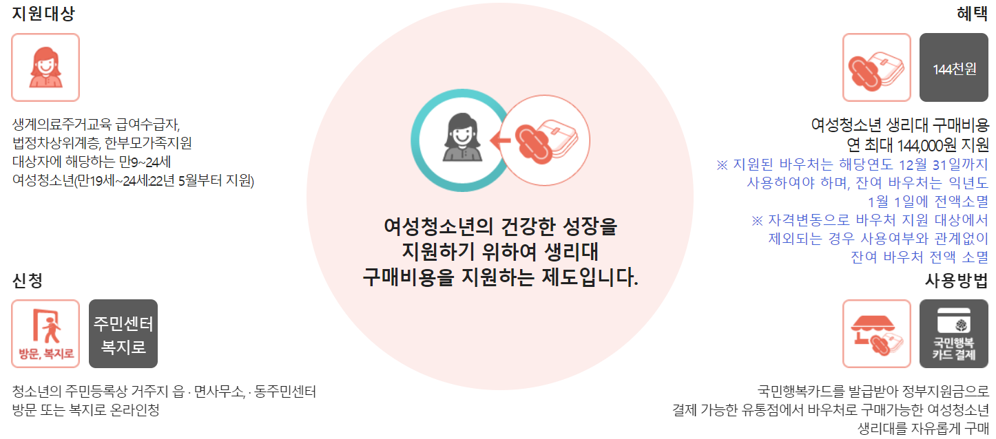 | 여성청소년 생리대 바우처 지원 | 생계· 의료· 주거· 교육 급여 수급자, 법정차상위계층, 한부모가족지원대상자에 해당하는 만11세~만18세 여성청소년 | ![]() |