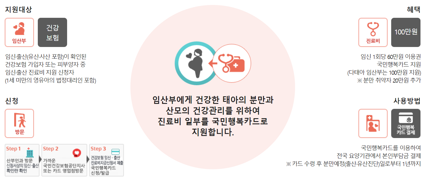 | 건강보험 임신·출산 진료비 지원 | 임신 1회당 60만원 이용권(국민행복카드, 고운맘카드) 지원 (다태아 임산부는 100만원 지원) |