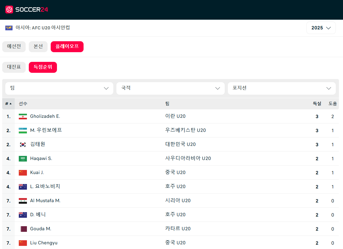 2025 AFC U-20 아시안컵 8강 대진표, 경기별 분석, 득점순위